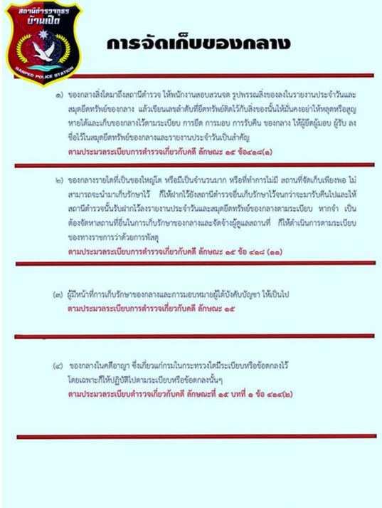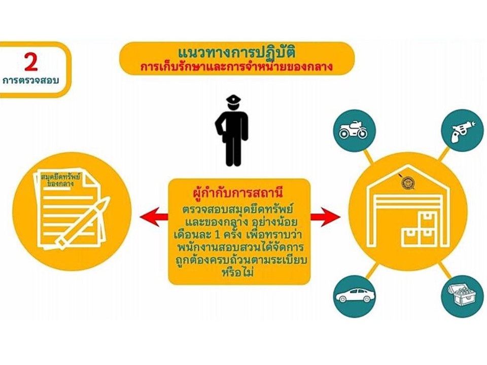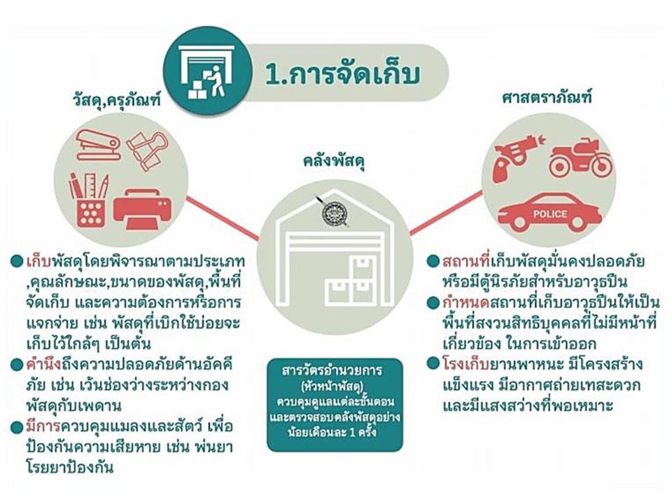 1.จำแนกประเภททรัพย์สินของทางราชการ อาวุธยุทภัณฑ์ และของบริจาค 2.กำหนดแนวทางควบคุม กำกับดูแลรักษา ตรวจนับ ตรวจสอบสภาพการใช้งานทรัพย์สินของราชการ ของบริจาคโดยเฉพาะทรัพย์ประเภทที่มีความเสี่ยงในการนำไปใช้โดยมิชอบ 3.ตรวจสอบและตรวจนับอาวุธยุทธภัณฑ์ของสถานีตำรวจเพือ่ให้มีความพร้อมต่อการใช่งานในภารกิจประจำวัน